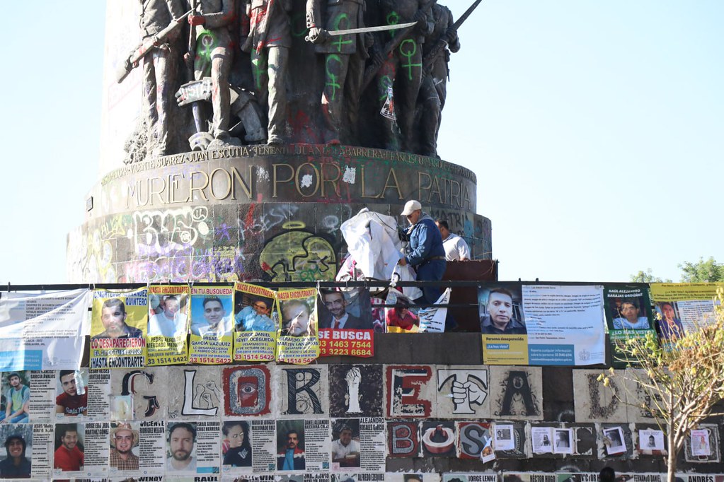 Con la guía, supervisión y autorización de representantes e integrantes de colectivos ciudadanos de búsqueda de personas desaparecidas, elementos operativos de Servicios Públicos Municipales realizaron hoy acciones de limpieza y mejoramiento del espacio público denominado Glorieta de las y los Desaparecidos, en la colonia Americana.