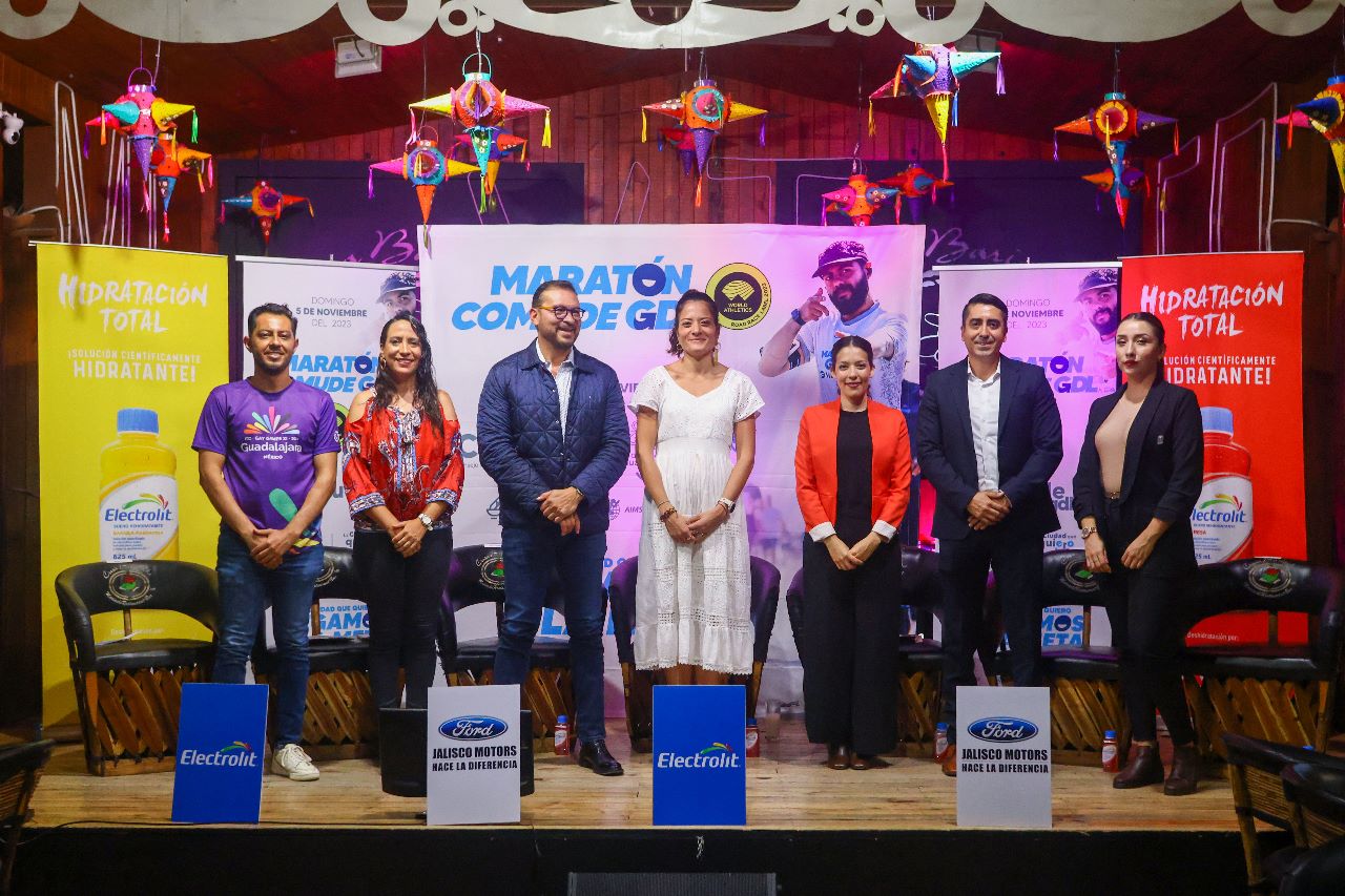 Arte, cultura, música y creatividad digital serán el distintivo de la fiesta deportiva del próximo domingo 5 de noviembre. Pablo Lemus Navarro, Presidente Municipal de Guadalajara presentó la playera y la medalla que portarán los miles de atletas en el Maratón Guadalajara Comude hidratado por Electrolit y la Carrera por Relevos Ford Jalisco Motors.