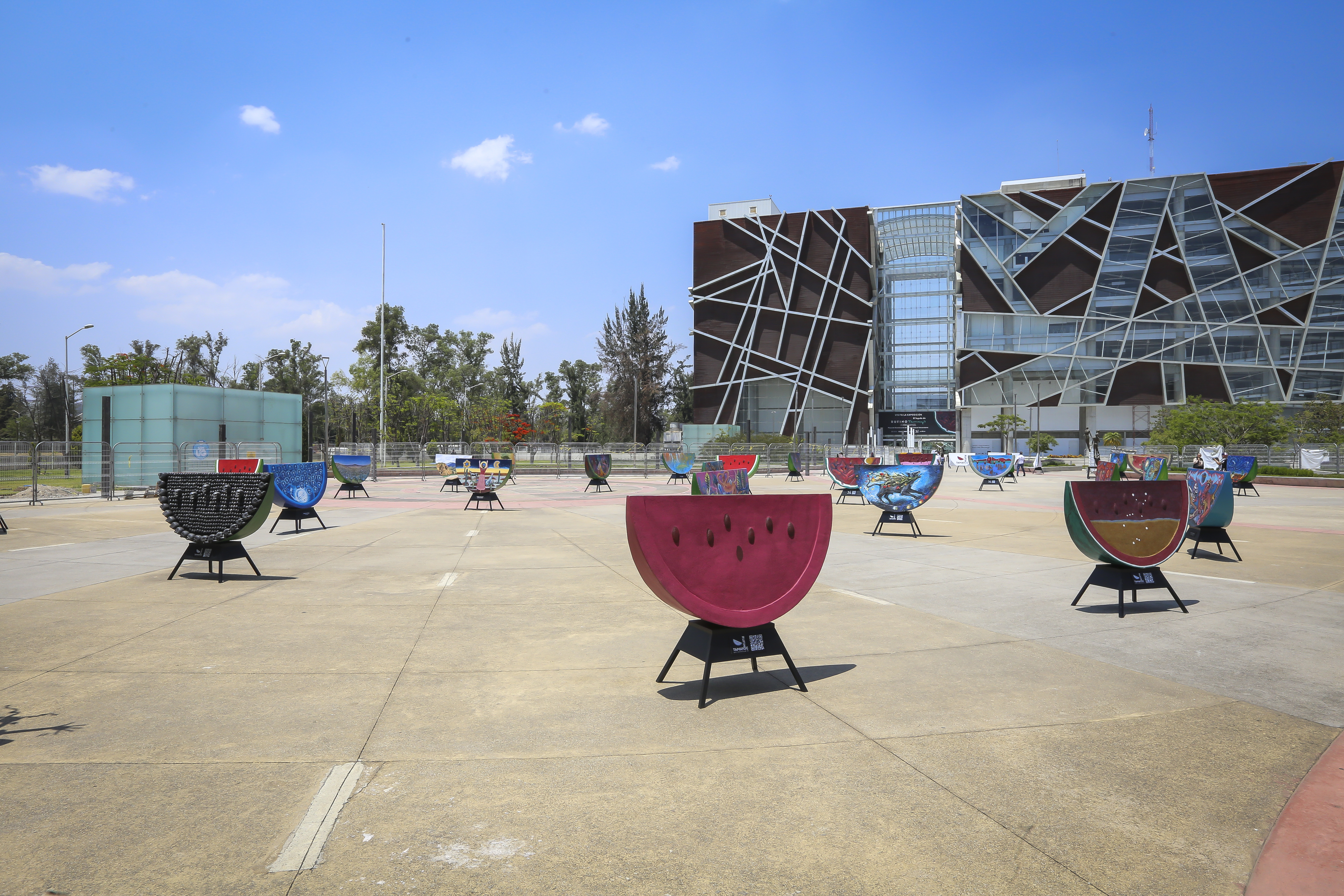 Artistas originarios de Oaxaca intervinieron 33 esculturas con forma de sandía en un homenaje al pintor Rufino Tamayo, esta muestra se exhibe gratuitamente hasta el 17 de octubre en la Plaza Bicentenario del Centro Cultural Universitario (CCU) de la Universidad de Guadalajara (UdeG).