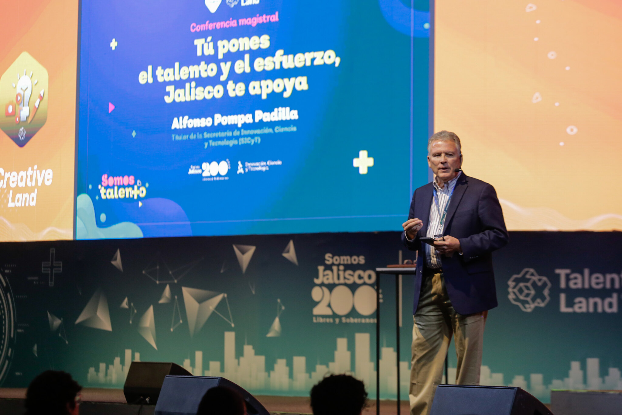 En Jalisco hay talento y se está apoyando, así lo detalló el titular de la Secretaría de Innovación, Ciencia y Tecnología (SICyT), Alfonso Pompa Padilla, en su conferencia magistral “Tú pones el talento y el esfuerzo, Jalisco te apoya”, en el tercer día de actividades de Jalisco Talent Land 2023.